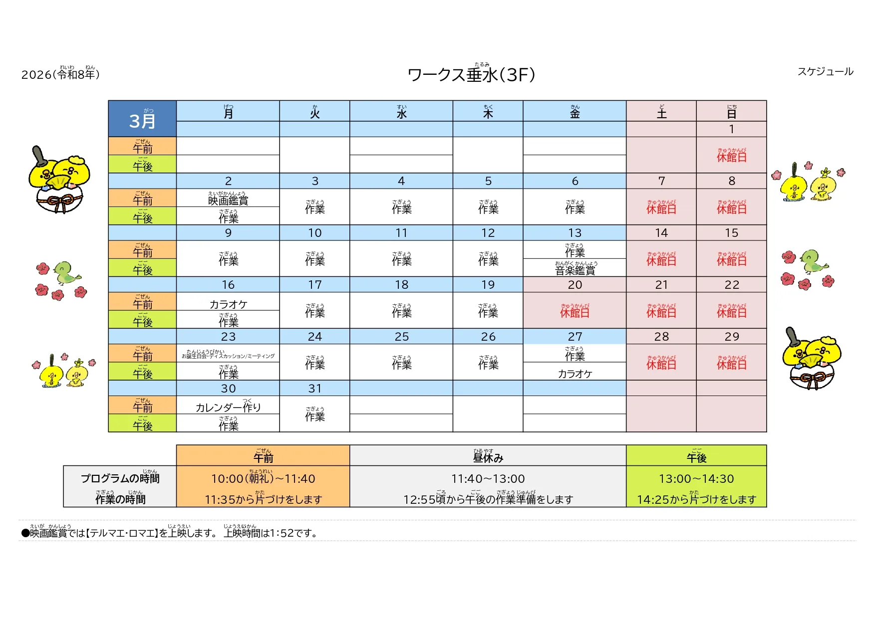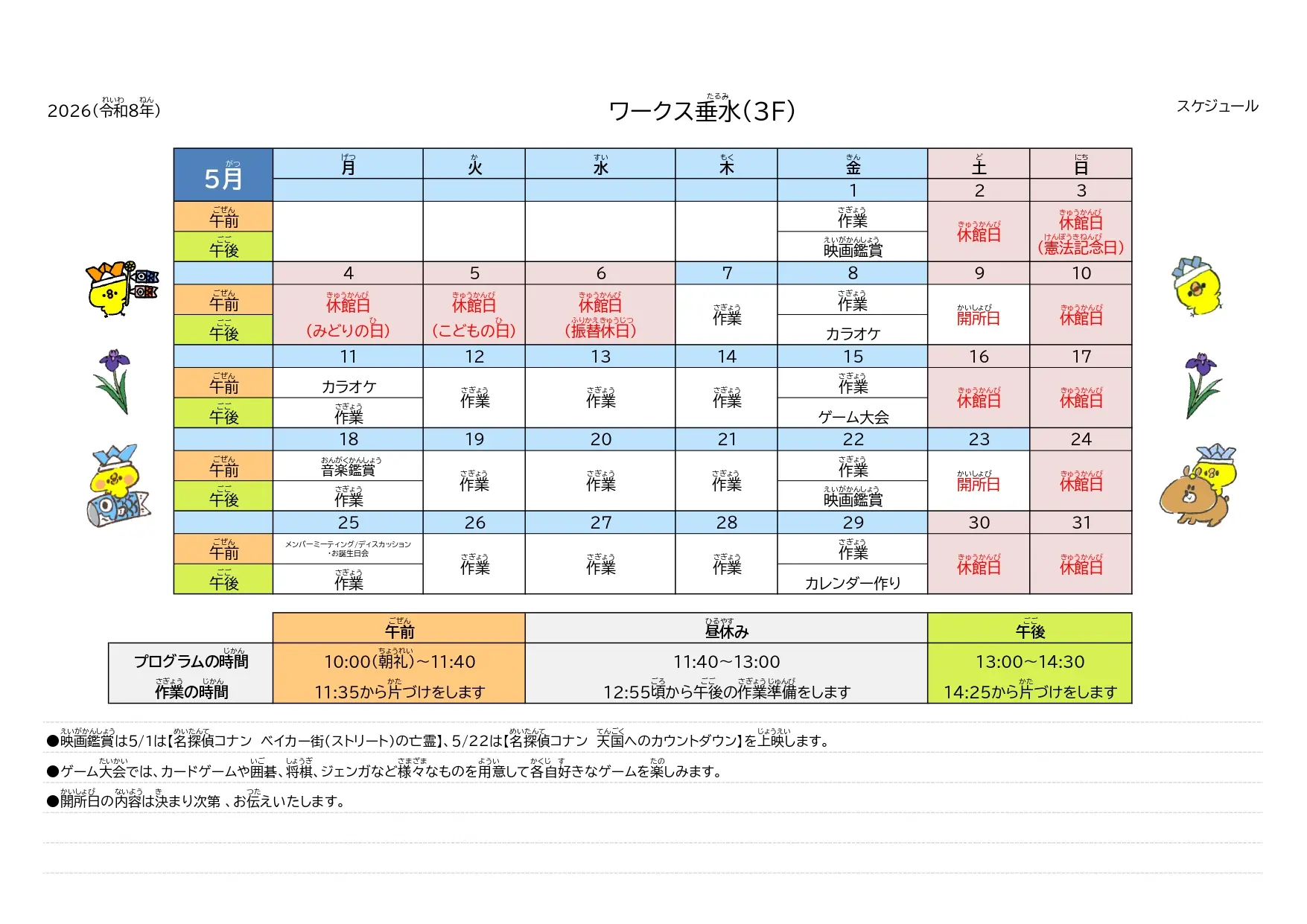 | 開所時間 | 9:30~14:30 ※土曜日は開所日を設ける場合があります。(不定期) |