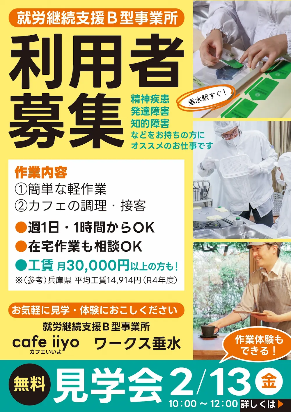【2/13無料】軽作業・カフェが選べる就労継続支援B型見学会@垂水区