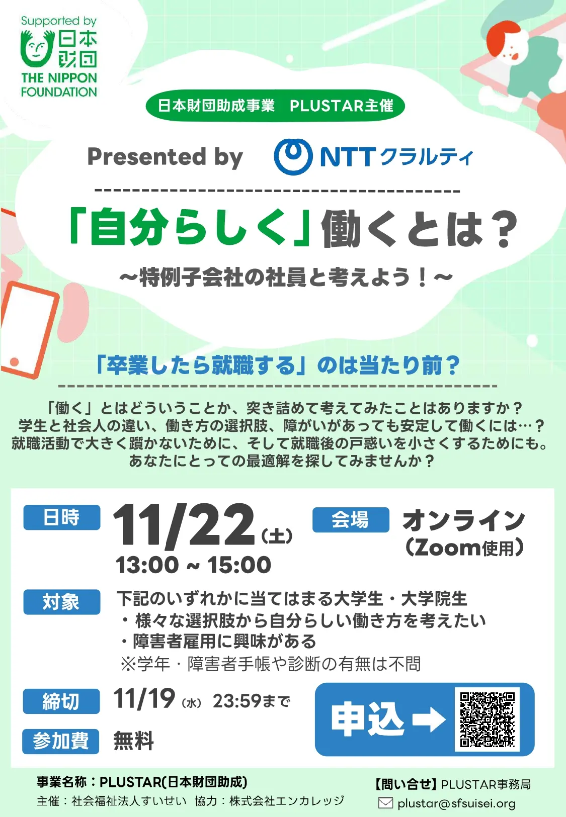 11/22(土)、NTTクラルティ様ご協力のもと、「NTTグループ」の特例子会社社員様とご一緒にあなたのキャリアを考える、無料オンラインイベントを開催いたします。